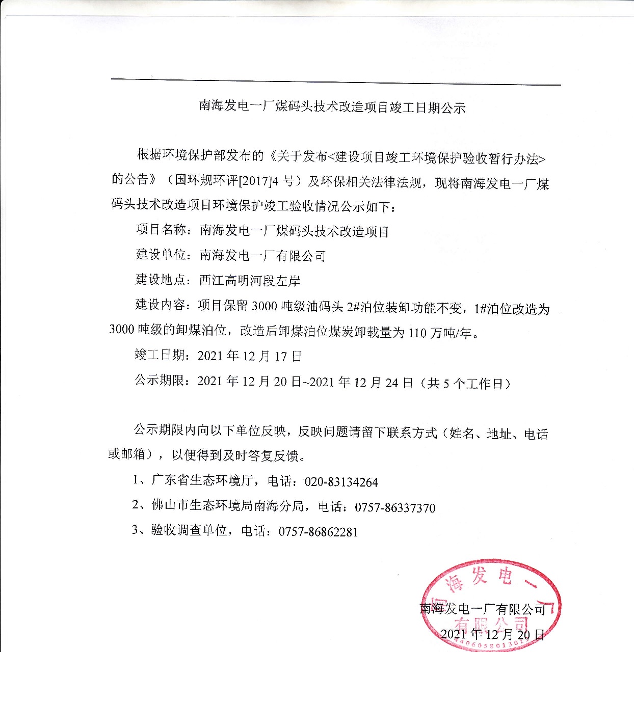 南海发电一厂煤码头技术改造项目竣工日期公示